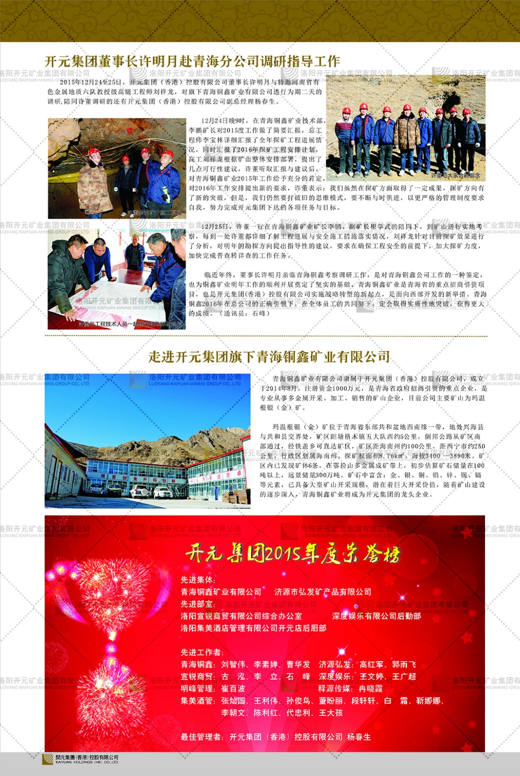 洛陽開元礦業(yè)集團(tuán)有限公司簡(jiǎn)介洛陽開元礦業(yè)集團(tuán)有限公司,始成立于2006年,位于洛陽市開元大道269號(hào)。集團(tuán)旗下共有十余家全資子公司,業(yè)務(wù)涉及有色金屬礦山開發(fā)、礦產(chǎn)品購(gòu)銷與進(jìn)出口貿(mào)易、房地產(chǎn)開發(fā)、文化藝術(shù)、企業(yè)管理與咨詢、資本投資等多個(gè)領(lǐng)域。民建河南省委委員、民建河南省委企業(yè)委副主任、民建洛陽市委委員、企業(yè)委主任、洛陽民建企業(yè)家協(xié)會(huì)會(huì)長(zhǎng)許明月是公司創(chuàng)始人,現(xiàn)任洛陽開元礦業(yè)集團(tuán)有限公司董事長(zhǎng)。在礦業(yè)領(lǐng)域,洛陽開元礦業(yè)集團(tuán)擁有多家實(shí)力雄厚的子公司:貴州開元礦業(yè)有限公司探、采礦權(quán)面積共11.33平方公里;興??h銅鑫礦業(yè)有限公司探礦權(quán)面積8.76平方公里,礦山資源潛力巨大;2021年,開元集團(tuán)與盧氏中科礦業(yè)有限公司開展戰(zhàn)略合作。盧氏中科礦業(yè)有限公司專注于有色金屬的浮選、加工和銷售,擁有強(qiáng)大的技術(shù)支撐平臺(tái),是集探、采、選、冶、研為一體的中大型綜合礦業(yè)企業(yè)。目前,盧氏中科王家河1000噸選礦廠已成功投產(chǎn),雙河金礦、柳關(guān)欒盧鉛鋅礦相繼順利開工,樓房銀礦與圪老灣鉛鋅礦的深部探礦重大突破,標(biāo)志著礦山版圖取得重大進(jìn)展,為開元集團(tuán)后續(xù)發(fā)展奠定了堅(jiān)實(shí)基礎(chǔ)。在文化傳媒領(lǐng)域,洛陽市明月美術(shù)館通過豐富多樣的藝術(shù)展覽、學(xué)術(shù)研討和公共教育活動(dòng),努力打造一個(gè)集展覽、交流、教育、研究為一體的綜合性藝術(shù)平臺(tái)。此外,在金融投資領(lǐng)域,開元集團(tuán)旗下的北京明峰資本管理有限公司專注于投資具有高增長(zhǎng)潛力的優(yōu)秀企業(yè),特別是高科技、新能源、環(huán)保等新興產(chǎn)業(yè),為客戶提供個(gè)性化的資產(chǎn)配置服務(wù)。在做好企業(yè)經(jīng)營(yíng)的同時(shí),開元集團(tuán)始終不忘企業(yè)的社會(huì)責(zé)任和家國(guó)情懷,以突出的愛心公益事跡,開展了一系列公益慈善活動(dòng):“民建林”公益事業(yè)通過“思源基金”“幫幫公益”線上公益平臺(tái),與眾多愛心人士籌措資金20余萬元;資助541名貧困大學(xué)生共計(jì)270余萬元,推進(jìn)“數(shù)字助力——河南AI人才培養(yǎng)”;捐款10萬元,馳援京津冀、黑龍江洪水地質(zhì)災(zāi)害……公司于2017年底被洛陽市慈善總會(huì)評(píng)為“洛陽慈善風(fēng)云榜——十大愛心集體”。洛陽開元礦業(yè)集團(tuán)有限公司秉承持續(xù)發(fā)展理念,憑借多年來良好的企業(yè)信譽(yù)與經(jīng)營(yíng)業(yè)績(jī),與全國(guó)多家企業(yè)建立了良好合作關(guān)系,受到社會(huì)各界的一致好評(píng),多次榮獲“納稅標(biāo)兵”“先進(jìn)企業(yè)”“招商引資模范企業(yè)”等榮譽(yù)稱號(hào)?;赝麃頃r(shí)路,開元人勠力同心,以“闖”的精神和“創(chuàng)”的勁頭,一路披荊斬棘,踏過千山萬水;展望新未來,開元人凝心聚力,不執(zhí)于“舊”,無畏于“新”,秉承“勇于跨越,追求卓越”的企業(yè)精神,乘著國(guó)家高質(zhì)量發(fā)展新征程的東風(fēng),跨過高山,越過大海,向著集團(tuán)多元化、國(guó)際化的目標(biāo),逐夢(mèng)遠(yuǎn)航,跨越前行!