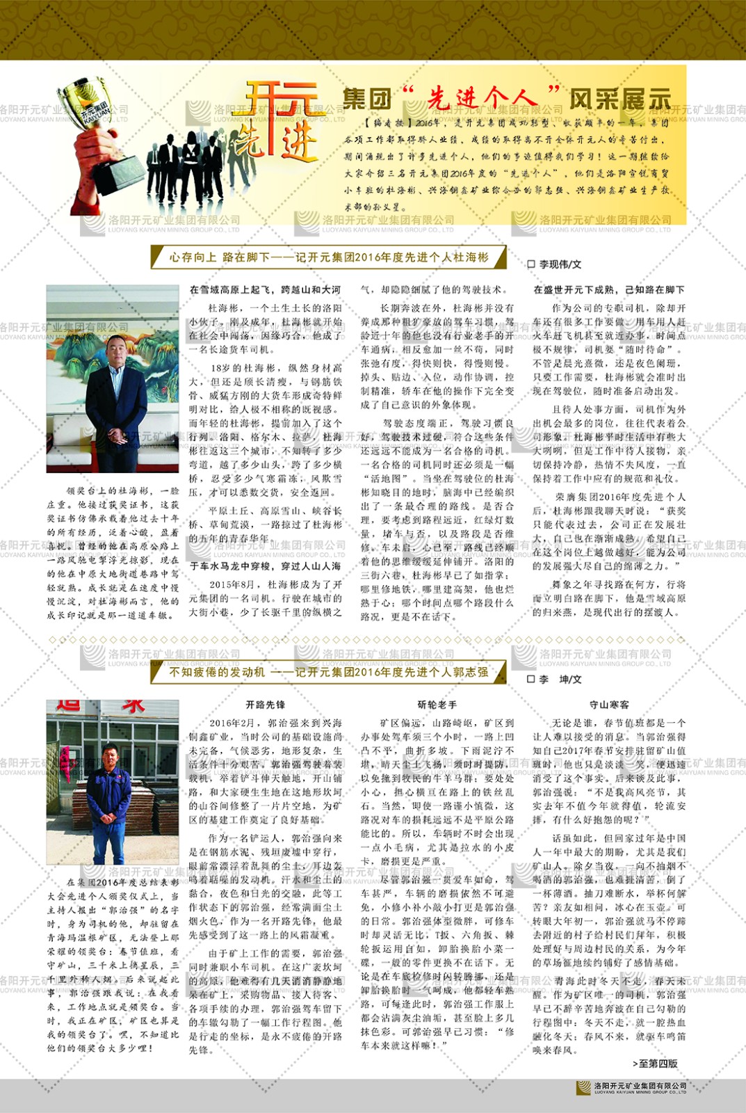 洛陽開元礦業(yè)集團(tuán)有限公司簡介洛陽開元礦業(yè)集團(tuán)有限公司,始成立于2006年,位于洛陽市開元大道269號。集團(tuán)旗下共有十余家全資子公司,業(yè)務(wù)涉及有色金屬礦山開發(fā)、礦產(chǎn)品購銷與進(jìn)出口貿(mào)易、房地產(chǎn)開發(fā)、文化藝術(shù)、企業(yè)管理與咨詢、資本投資等多個(gè)領(lǐng)域。民建河南省委委員、民建河南省委企業(yè)委副主任、民建洛陽市委委員、企業(yè)委主任、洛陽民建企業(yè)家協(xié)會會長許明月是公司創(chuàng)始人,現(xiàn)任洛陽開元礦業(yè)集團(tuán)有限公司董事長。在礦業(yè)領(lǐng)域,洛陽開元礦業(yè)集團(tuán)擁有多家實(shí)力雄厚的子公司:貴州開元礦業(yè)有限公司探、采礦權(quán)面積共11.33平方公里;興??h銅鑫礦業(yè)有限公司探礦權(quán)面積8.76平方公里,礦山資源潛力巨大;2021年,開元集團(tuán)與盧氏中科礦業(yè)有限公司開展戰(zhàn)略合作。盧氏中科礦業(yè)有限公司專注于有色金屬的浮選、加工和銷售,擁有強(qiáng)大的技術(shù)支撐平臺,是集探、采、選、冶、研為一體的中大型綜合礦業(yè)企業(yè)。目前,盧氏中科王家河1000噸選礦廠已成功投產(chǎn),雙河金礦、柳關(guān)欒盧鉛鋅礦相繼順利開工,樓房銀礦與圪老灣鉛鋅礦的深部探礦重大突破,標(biāo)志著礦山版圖取得重大進(jìn)展,為開元集團(tuán)后續(xù)發(fā)展奠定了堅(jiān)實(shí)基礎(chǔ)。在文化傳媒領(lǐng)域,洛陽市明月美術(shù)館通過豐富多樣的藝術(shù)展覽、學(xué)術(shù)研討和公共教育活動(dòng),努力打造一個(gè)集展覽、交流、教育、研究為一體的綜合性藝術(shù)平臺。此外,在金融投資領(lǐng)域,開元集團(tuán)旗下的北京明峰資本管理有限公司專注于投資具有高增長潛力的優(yōu)秀企業(yè),特別是高科技、新能源、環(huán)保等新興產(chǎn)業(yè),為客戶提供個(gè)性化的資產(chǎn)配置服務(wù)。在做好企業(yè)經(jīng)營的同時(shí),開元集團(tuán)始終不忘企業(yè)的社會責(zé)任和家國情懷,以突出的愛心公益事跡,開展了一系列公益慈善活動(dòng):“民建林”公益事業(yè)通過“思源基金”“幫幫公益”線上公益平臺,與眾多愛心人士籌措資金20余萬元;資助541名貧困大學(xué)生共計(jì)270余萬元,推進(jìn)“數(shù)字助力——河南AI人才培養(yǎng)”;捐款10萬元,馳援京津冀、黑龍江洪水地質(zhì)災(zāi)害……公司于2017年底被洛陽市慈善總會評為“洛陽慈善風(fēng)云榜——十大愛心集體”。洛陽開元礦業(yè)集團(tuán)有限公司秉承持續(xù)發(fā)展理念,憑借多年來良好的企業(yè)信譽(yù)與經(jīng)營業(yè)績,與全國多家企業(yè)建立了良好合作關(guān)系,受到社會各界的一致好評,多次榮獲“納稅標(biāo)兵”“先進(jìn)企業(yè)”“招商引資模范企業(yè)”等榮譽(yù)稱號?;赝麃頃r(shí)路,開元人勠力同心,以“闖”的精神和“創(chuàng)”的勁頭,一路披荊斬棘,踏過千山萬水;展望新未來,開元人凝心聚力,不執(zhí)于“舊”,無畏于“新”,秉承“勇于跨越,追求卓越”的企業(yè)精神,乘著國家高質(zhì)量發(fā)展新征程的東風(fēng),跨過高山,越過大海,向著集團(tuán)多元化、國際化的目標(biāo),逐夢遠(yuǎn)航,跨越前行!