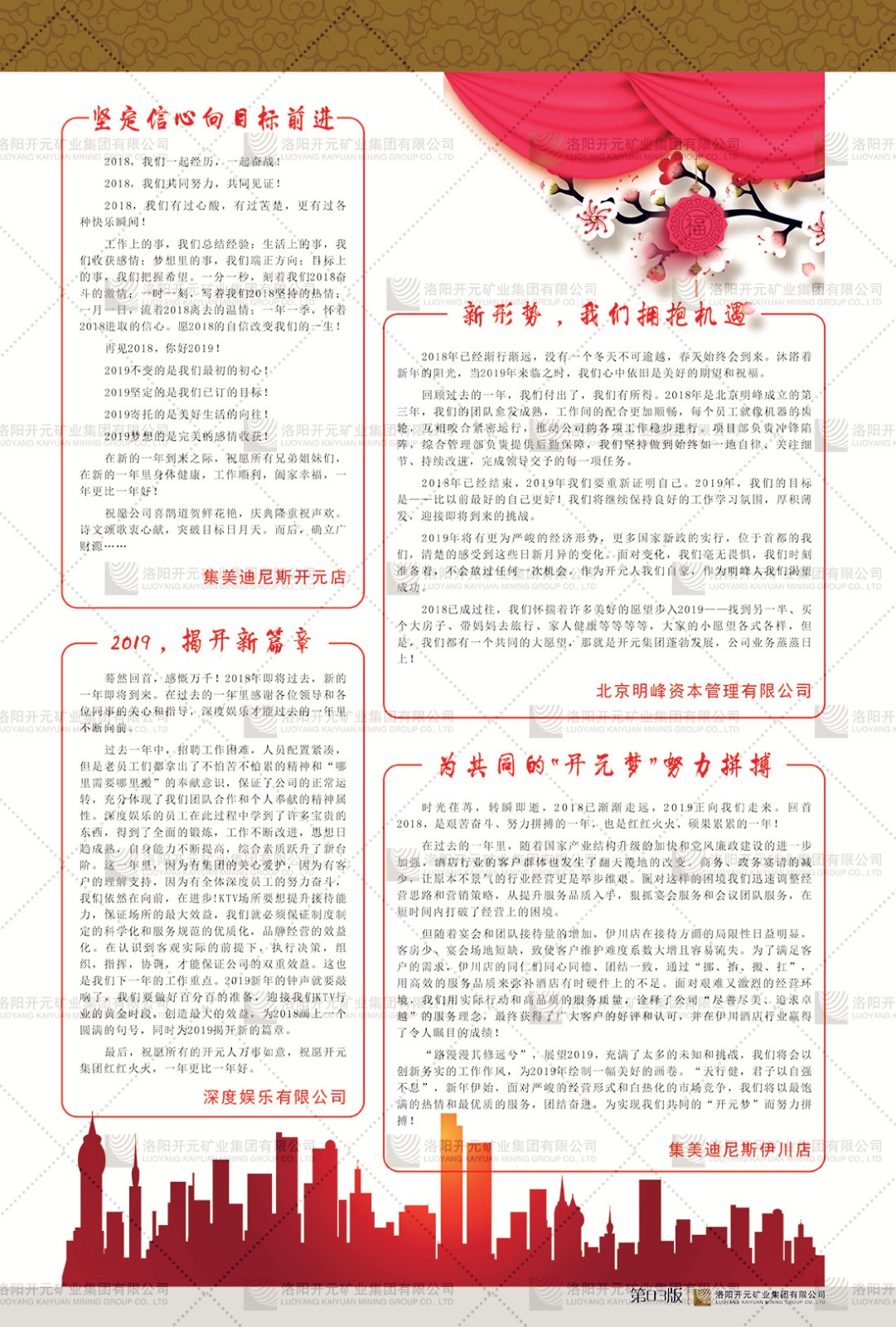 洛陽開元礦業(yè)集團有限公司簡介洛陽開元礦業(yè)集團有限公司,始成立于2006年,位于洛陽市開元大道269號。集團旗下共有十余家全資子公司,業(yè)務涉及有色金屬礦山開發(fā)、礦產(chǎn)品購銷與進出口貿(mào)易、房地產(chǎn)開發(fā)、文化藝術、企業(yè)管理與咨詢、資本投資等多個領域。民建河南省委委員、民建河南省委企業(yè)委副主任、民建洛陽市委委員、企業(yè)委主任、洛陽民建企業(yè)家協(xié)會會長許明月是公司創(chuàng)始人,現(xiàn)任洛陽開元礦業(yè)集團有限公司董事長。在礦業(yè)領域,洛陽開元礦業(yè)集團擁有多家實力雄厚的子公司:貴州開元礦業(yè)有限公司探、采礦權面積共11.33平方公里;興海縣銅鑫礦業(yè)有限公司探礦權面積8.76平方公里,礦山資源潛力巨大;2021年,開元集團與盧氏中科礦業(yè)有限公司開展戰(zhàn)略合作。盧氏中科礦業(yè)有限公司專注于有色金屬的浮選、加工和銷售,擁有強大的技術支撐平臺,是集探、采、選、冶、研為一體的中大型綜合礦業(yè)企業(yè)。目前,盧氏中科王家河1000噸選礦廠已成功投產(chǎn),雙河金礦、柳關欒盧鉛鋅礦相繼順利開工,樓房銀礦與圪老灣鉛鋅礦的深部探礦重大突破,標志著礦山版圖取得重大進展,為開元集團后續(xù)發(fā)展奠定了堅實基礎。在文化傳媒領域,洛陽市明月美術館通過豐富多樣的藝術展覽、學術研討和公共教育活動,努力打造一個集展覽、交流、教育、研究為一體的綜合性藝術平臺。此外,在金融投資領域,開元集團旗下的北京明峰資本管理有限公司專注于投資具有高增長潛力的優(yōu)秀企業(yè),特別是高科技、新能源、環(huán)保等新興產(chǎn)業(yè),為客戶提供個性化的資產(chǎn)配置服務。在做好企業(yè)經(jīng)營的同時,開元集團始終不忘企業(yè)的社會責任和家國情懷,以突出的愛心公益事跡,開展了一系列公益慈善活動:“民建林”公益事業(yè)通過“思源基金”“幫幫公益”線上公益平臺,與眾多愛心人士籌措資金20余萬元;資助541名貧困大學生共計270余萬元,推進“數(shù)字助力——河南AI人才培養(yǎng)”;捐款10萬元,馳援京津冀、黑龍江洪水地質(zhì)災害……公司于2017年底被洛陽市慈善總會評為“洛陽慈善風云榜——十大愛心集體”。洛陽開元礦業(yè)集團有限公司秉承持續(xù)發(fā)展理念,憑借多年來良好的企業(yè)信譽與經(jīng)營業(yè)績,與全國多家企業(yè)建立了良好合作關系,受到社會各界的一致好評,多次榮獲“納稅標兵”“先進企業(yè)”“招商引資模范企業(yè)”等榮譽稱號?;赝麃頃r路,開元人勠力同心,以“闖”的精神和“創(chuàng)”的勁頭,一路披荊斬棘,踏過千山萬水;展望新未來,開元人凝心聚力,不執(zhí)于“舊”,無畏于“新”,秉承“勇于跨越,追求卓越”的企業(yè)精神,乘著國家高質(zhì)量發(fā)展新征程的東風,跨過高山,越過大海,向著集團多元化、國際化的目標,逐夢遠航,跨越前行!