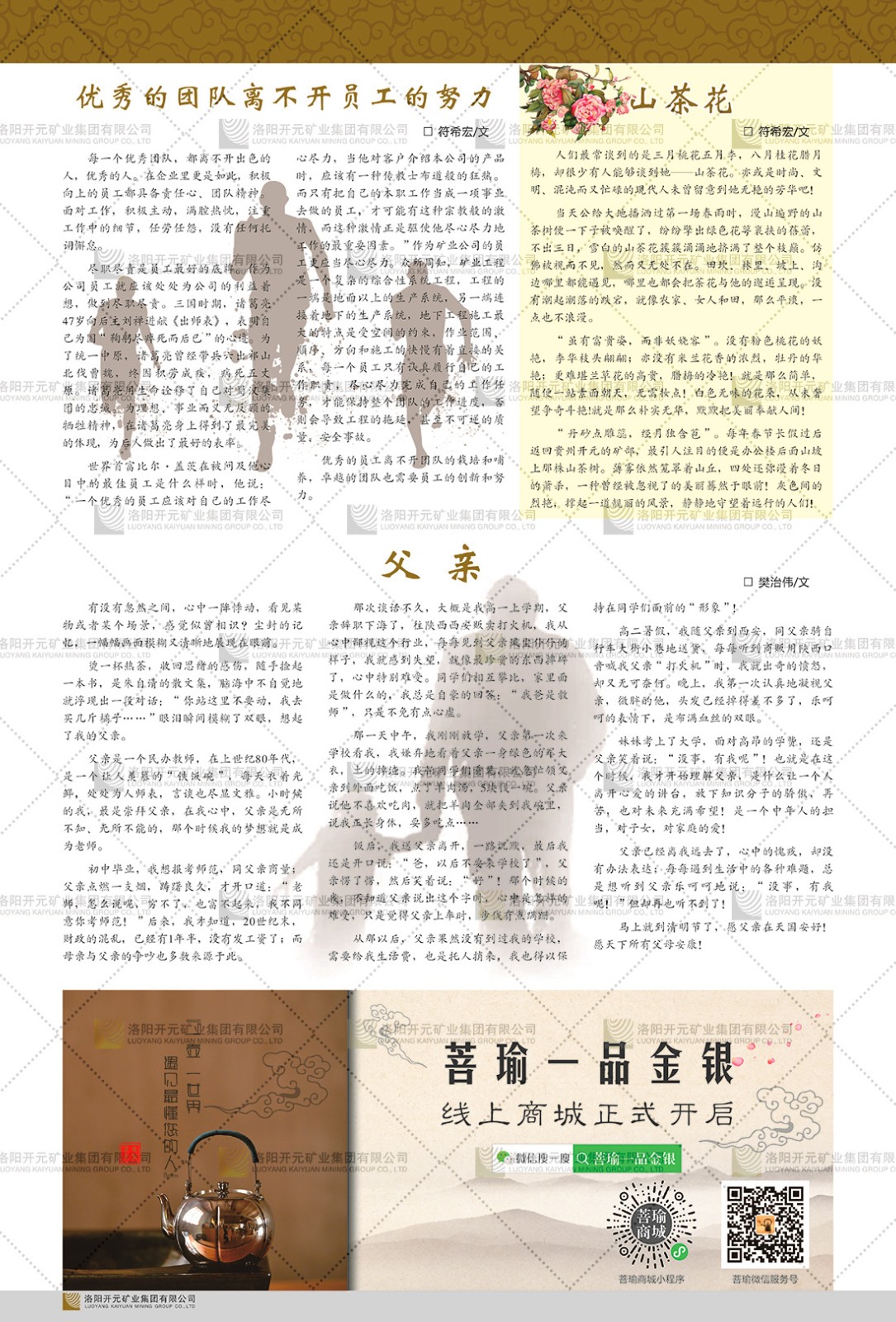 洛陽開元礦業(yè)集團有限公司簡介洛陽開元礦業(yè)集團有限公司,始成立于2006年,位于洛陽市開元大道269號。集團旗下共有十余家全資子公司,業(yè)務涉及有色金屬礦山開發(fā)、礦產品購銷與進出口貿易、房地產開發(fā)、文化藝術、企業(yè)管理與咨詢、資本投資等多個領域。民建河南省委委員、民建河南省委企業(yè)委副主任、民建洛陽市委委員、企業(yè)委主任、洛陽民建企業(yè)家協會會長許明月是公司創(chuàng)始人,現任洛陽開元礦業(yè)集團有限公司董事長。在礦業(yè)領域,洛陽開元礦業(yè)集團擁有多家實力雄厚的子公司:貴州開元礦業(yè)有限公司探、采礦權面積共11.33平方公里;興??h銅鑫礦業(yè)有限公司探礦權面積8.76平方公里,礦山資源潛力巨大;2021年,開元集團與盧氏中科礦業(yè)有限公司開展戰(zhàn)略合作。盧氏中科礦業(yè)有限公司專注于有色金屬的浮選、加工和銷售,擁有強大的技術支撐平臺,是集探、采、選、冶、研為一體的中大型綜合礦業(yè)企業(yè)。目前,盧氏中科王家河1000噸選礦廠已成功投產,雙河金礦、柳關欒盧鉛鋅礦相繼順利開工,樓房銀礦與圪老灣鉛鋅礦的深部探礦重大突破,標志著礦山版圖取得重大進展,為開元集團后續(xù)發(fā)展奠定了堅實基礎。在文化傳媒領域,洛陽市明月美術館通過豐富多樣的藝術展覽、學術研討和公共教育活動,努力打造一個集展覽、交流、教育、研究為一體的綜合性藝術平臺。此外,在金融投資領域,開元集團旗下的北京明峰資本管理有限公司專注于投資具有高增長潛力的優(yōu)秀企業(yè),特別是高科技、新能源、環(huán)保等新興產業(yè),為客戶提供個性化的資產配置服務。在做好企業(yè)經營的同時,開元集團始終不忘企業(yè)的社會責任和家國情懷,以突出的愛心公益事跡,開展了一系列公益慈善活動:“民建林”公益事業(yè)通過“思源基金”“幫幫公益”線上公益平臺,與眾多愛心人士籌措資金20余萬元;資助541名貧困大學生共計270余萬元,推進“數字助力——河南AI人才培養(yǎng)”;捐款10萬元,馳援京津冀、黑龍江洪水地質災害……公司于2017年底被洛陽市慈善總會評為“洛陽慈善風云榜——十大愛心集體”。洛陽開元礦業(yè)集團有限公司秉承持續(xù)發(fā)展理念,憑借多年來良好的企業(yè)信譽與經營業(yè)績,與全國多家企業(yè)建立了良好合作關系,受到社會各界的一致好評,多次榮獲“納稅標兵”“先進企業(yè)”“招商引資模范企業(yè)”等榮譽稱號。回望來時路,開元人勠力同心,以“闖”的精神和“創(chuàng)”的勁頭,一路披荊斬棘,踏過千山萬水;展望新未來,開元人凝心聚力,不執(zhí)于“舊”,無畏于“新”,秉承“勇于跨越,追求卓越”的企業(yè)精神,乘著國家高質量發(fā)展新征程的東風,跨過高山,越過大海,向著集團多元化、國際化的目標,逐夢遠航,跨越前行!
