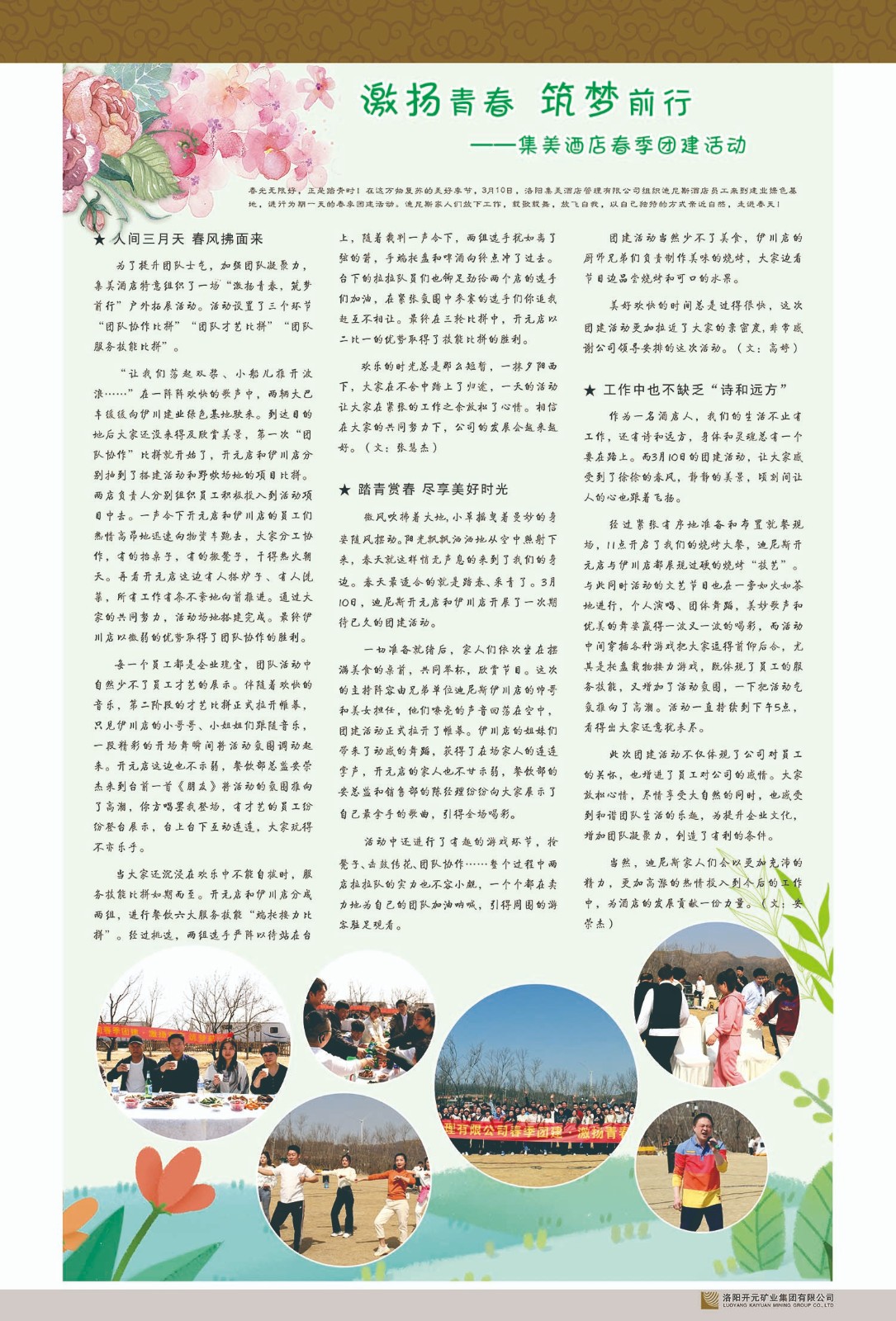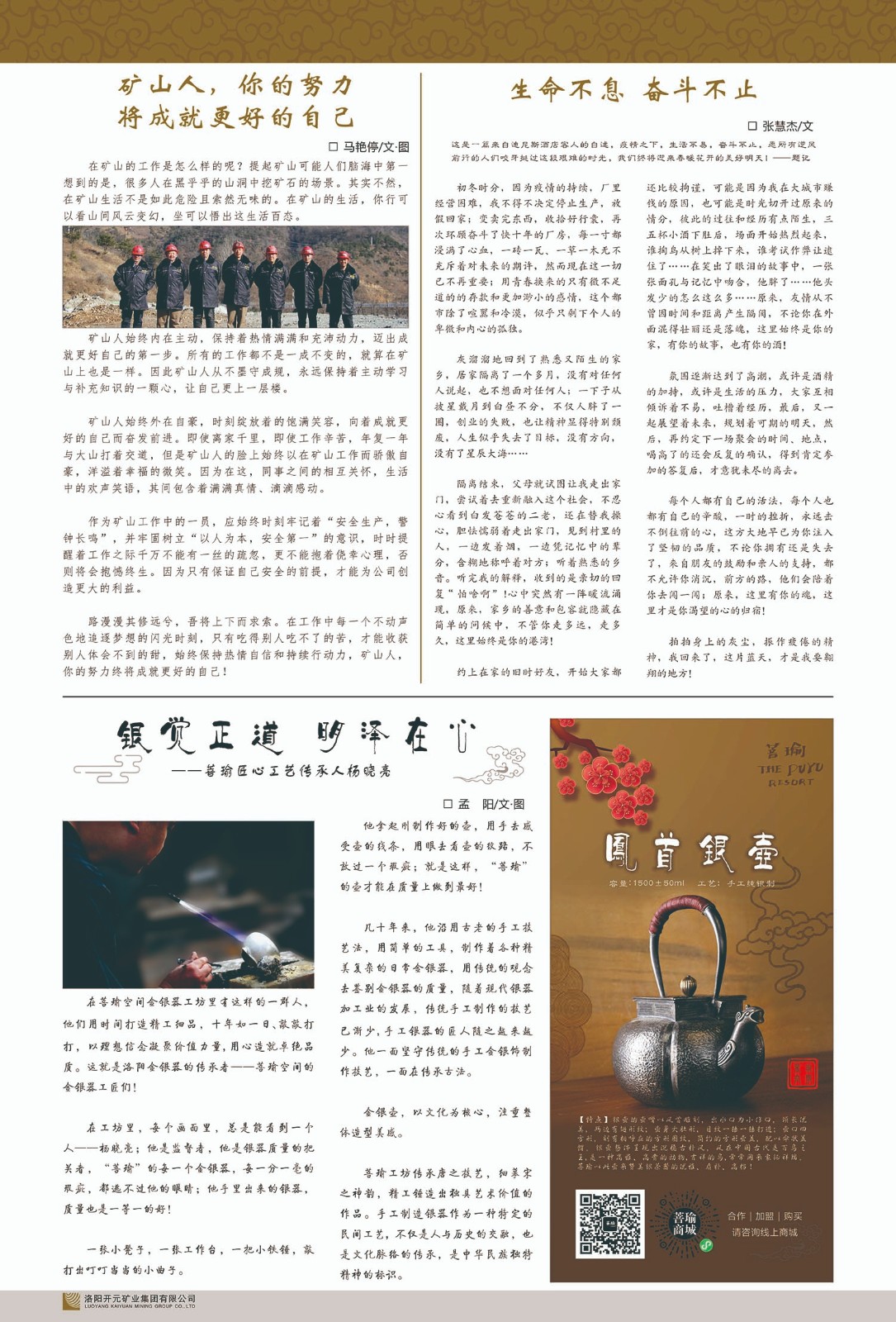 洛陽(yáng)開(kāi)元礦業(yè)集團(tuán)有限公司簡(jiǎn)介洛陽(yáng)開(kāi)元礦業(yè)集團(tuán)有限公司,始成立于2006年,位于洛陽(yáng)市開(kāi)元大道269號(hào)。集團(tuán)旗下共有十余家全資子公司,業(yè)務(wù)涉及有色金屬礦山開(kāi)發(fā)、礦產(chǎn)品購(gòu)銷(xiāo)與進(jìn)出口貿(mào)易、房地產(chǎn)開(kāi)發(fā)、文化藝術(shù)、企業(yè)管理與咨詢、資本投資等多個(gè)領(lǐng)域。民建河南省委委員、民建河南省委企業(yè)委副主任、民建洛陽(yáng)市委委員、企業(yè)委主任、洛陽(yáng)民建企業(yè)家協(xié)會(huì)會(huì)長(zhǎng)許明月是公司創(chuàng)始人,現(xiàn)任洛陽(yáng)開(kāi)元礦業(yè)集團(tuán)有限公司董事長(zhǎng)。在礦業(yè)領(lǐng)域,洛陽(yáng)開(kāi)元礦業(yè)集團(tuán)擁有多家實(shí)力雄厚的子公司:貴州開(kāi)元礦業(yè)有限公司探、采礦權(quán)面積共11.33平方公里;興海縣銅鑫礦業(yè)有限公司探礦權(quán)面積8.76平方公里,礦山資源潛力巨大;2021年,開(kāi)元集團(tuán)與盧氏中科礦業(yè)有限公司開(kāi)展戰(zhàn)略合作。盧氏中科礦業(yè)有限公司專注于有色金屬的浮選、加工和銷(xiāo)售,擁有強(qiáng)大的技術(shù)支撐平臺(tái),是集探、采、選、冶、研為一體的中大型綜合礦業(yè)企業(yè)。目前,盧氏中科王家河1000噸選礦廠已成功投產(chǎn),雙河金礦、柳關(guān)欒盧鉛鋅礦相繼順利開(kāi)工,樓房銀礦與圪老灣鉛鋅礦的深部探礦重大突破,標(biāo)志著礦山版圖取得重大進(jìn)展,為開(kāi)元集團(tuán)后續(xù)發(fā)展奠定了堅(jiān)實(shí)基礎(chǔ)。在文化傳媒領(lǐng)域,洛陽(yáng)市明月美術(shù)館通過(guò)豐富多樣的藝術(shù)展覽、學(xué)術(shù)研討和公共教育活動(dòng),努力打造一個(gè)集展覽、交流、教育、研究為一體的綜合性藝術(shù)平臺(tái)。此外,在金融投資領(lǐng)域,開(kāi)元集團(tuán)旗下的北京明峰資本管理有限公司專注于投資具有高增長(zhǎng)潛力的優(yōu)秀企業(yè),特別是高科技、新能源、環(huán)保等新興產(chǎn)業(yè),為客戶提供個(gè)性化的資產(chǎn)配置服務(wù)。在做好企業(yè)經(jīng)營(yíng)的同時(shí),開(kāi)元集團(tuán)始終不忘企業(yè)的社會(huì)責(zé)任和家國(guó)情懷,以突出的愛(ài)心公益事跡,開(kāi)展了一系列公益慈善活動(dòng):“民建林”公益事業(yè)通過(guò)“思源基金”“幫幫公益”線上公益平臺(tái),與眾多愛(ài)心人士籌措資金20余萬(wàn)元;資助541名貧困大學(xué)生共計(jì)270余萬(wàn)元,推進(jìn)“數(shù)字助力——河南AI人才培養(yǎng)”;捐款10萬(wàn)元,馳援京津冀、黑龍江洪水地質(zhì)災(zāi)害……公司于2017年底被洛陽(yáng)市慈善總會(huì)評(píng)為“洛陽(yáng)慈善風(fēng)云榜——十大愛(ài)心集體”。洛陽(yáng)開(kāi)元礦業(yè)集團(tuán)有限公司秉承持續(xù)發(fā)展理念,憑借多年來(lái)良好的企業(yè)信譽(yù)與經(jīng)營(yíng)業(yè)績(jī),與全國(guó)多家企業(yè)建立了良好合作關(guān)系,受到社會(huì)各界的一致好評(píng),多次榮獲“納稅標(biāo)兵”“先進(jìn)企業(yè)”“招商引資模范企業(yè)”等榮譽(yù)稱號(hào)?;赝麃?lái)時(shí)路,開(kāi)元人勠力同心,以“闖”的精神和“創(chuàng)”的勁頭,一路披荊斬棘,踏過(guò)千山萬(wàn)水;展望新未來(lái),開(kāi)元人凝心聚力,不執(zhí)于“舊”,無(wú)畏于“新”,秉承“勇于跨越,追求卓越”的企業(yè)精神,乘著國(guó)家高質(zhì)量發(fā)展新征程的東風(fēng),跨過(guò)高山,越過(guò)大海,向著集團(tuán)多元化、國(guó)際化的目標(biāo),逐夢(mèng)遠(yuǎn)航,跨越前行!