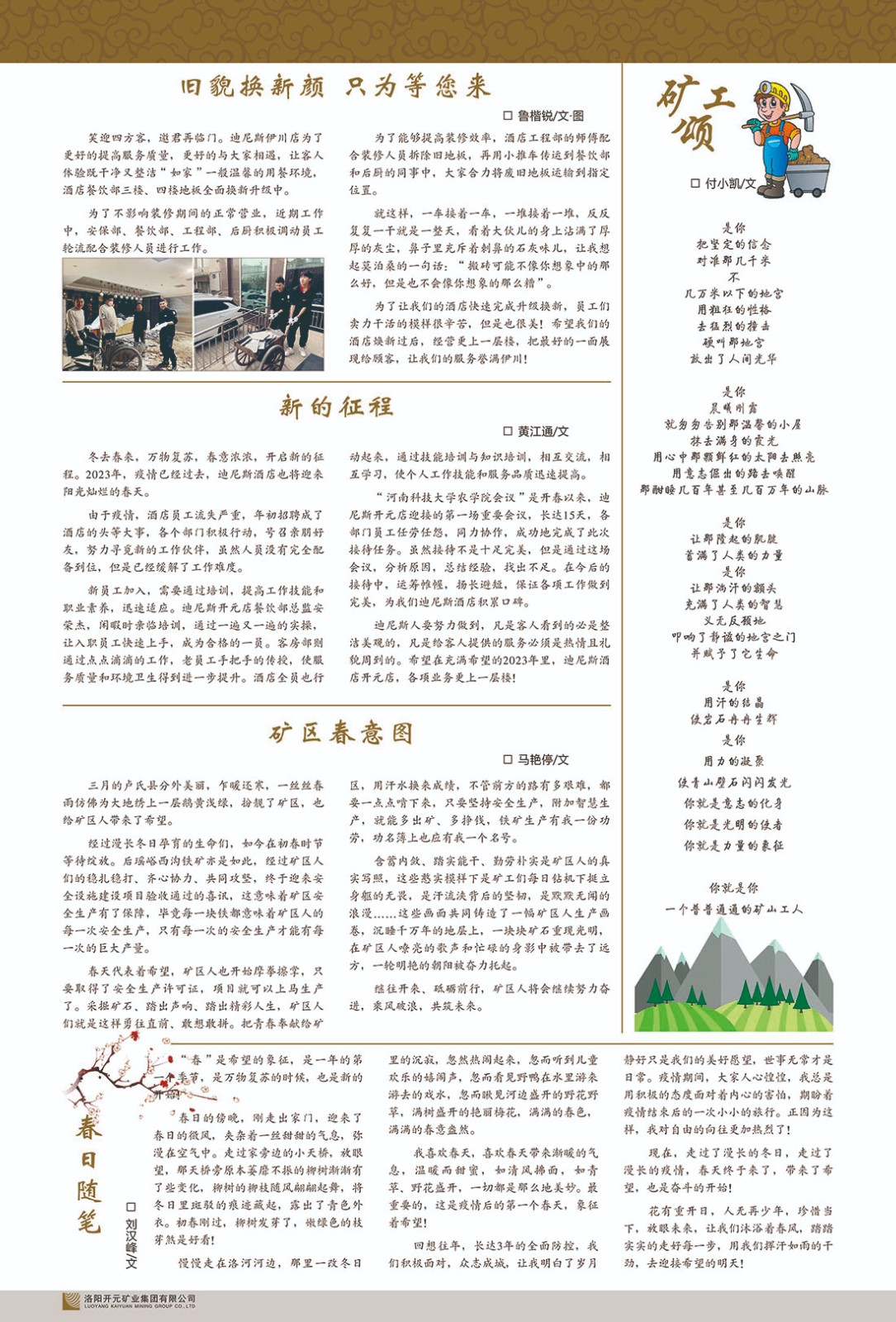 洛陽開元礦業(yè)集團有限公司簡介洛陽開元礦業(yè)集團有限公司,始成立于2006年,位于洛陽市開元大道269號。集團旗下共有十余家全資子公司,業(yè)務涉及有色金屬礦山開發(fā)、礦產(chǎn)品購銷與進出口貿(mào)易、房地產(chǎn)開發(fā)、文化藝術、企業(yè)管理與咨詢、資本投資等多個領域。民建河南省委委員、民建河南省委企業(yè)委副主任、民建洛陽市委委員、企業(yè)委主任、洛陽民建企業(yè)家協(xié)會會長許明月是公司創(chuàng)始人,現(xiàn)任洛陽開元礦業(yè)集團有限公司董事長。在礦業(yè)領域,洛陽開元礦業(yè)集團擁有多家實力雄厚的子公司:貴州開元礦業(yè)有限公司探、采礦權面積共11.33平方公里;興??h銅鑫礦業(yè)有限公司探礦權面積8.76平方公里,礦山資源潛力巨大;2021年,開元集團與盧氏中科礦業(yè)有限公司開展戰(zhàn)略合作。盧氏中科礦業(yè)有限公司專注于有色金屬的浮選、加工和銷售,擁有強大的技術支撐平臺,是集探、采、選、冶、研為一體的中大型綜合礦業(yè)企業(yè)。目前,盧氏中科王家河1000噸選礦廠已成功投產(chǎn),雙河金礦、柳關欒盧鉛鋅礦相繼順利開工,樓房銀礦與圪老灣鉛鋅礦的深部探礦重大突破,標志著礦山版圖取得重大進展,為開元集團后續(xù)發(fā)展奠定了堅實基礎。在文化傳媒領域,洛陽市明月美術館通過豐富多樣的藝術展覽、學術研討和公共教育活動,努力打造一個集展覽、交流、教育、研究為一體的綜合性藝術平臺。此外,在金融投資領域,開元集團旗下的北京明峰資本管理有限公司專注于投資具有高增長潛力的優(yōu)秀企業(yè),特別是高科技、新能源、環(huán)保等新興產(chǎn)業(yè),為客戶提供個性化的資產(chǎn)配置服務。在做好企業(yè)經(jīng)營的同時,開元集團始終不忘企業(yè)的社會責任和家國情懷,以突出的愛心公益事跡,開展了一系列公益慈善活動:“民建林”公益事業(yè)通過“思源基金”“幫幫公益”線上公益平臺,與眾多愛心人士籌措資金20余萬元;資助541名貧困大學生共計270余萬元,推進“數(shù)字助力——河南AI人才培養(yǎng)”;捐款10萬元,馳援京津冀、黑龍江洪水地質(zhì)災害……公司于2017年底被洛陽市慈善總會評為“洛陽慈善風云榜——十大愛心集體”。洛陽開元礦業(yè)集團有限公司秉承持續(xù)發(fā)展理念,憑借多年來良好的企業(yè)信譽與經(jīng)營業(yè)績,與全國多家企業(yè)建立了良好合作關系,受到社會各界的一致好評,多次榮獲“納稅標兵”“先進企業(yè)”“招商引資模范企業(yè)”等榮譽稱號?;赝麃頃r路,開元人勠力同心,以“闖”的精神和“創(chuàng)”的勁頭,一路披荊斬棘,踏過千山萬水;展望新未來,開元人凝心聚力,不執(zhí)于“舊”,無畏于“新”,秉承“勇于跨越,追求卓越”的企業(yè)精神,乘著國家高質(zhì)量發(fā)展新征程的東風,跨過高山,越過大海,向著集團多元化、國際化的目標,逐夢遠航,跨越前行!